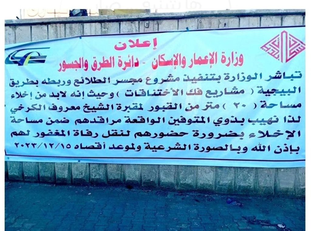 وفي وقت سابق اظهرت لافتة اطلعت عليها “بغداد اليوم”، منح وزارة الاعمار والاسكان موعدا اقصاه 15/12/2023، اي بعد 15 يوما من الان، لذوي بعض المتوفين، الذين تقع قبورهم ضمن مساحة تبلغ 20 مترا كتوسعة، تحتاجها الشركة المنفذة لمشروع مجسر الطلائع وربطه بطريق البيجية، لنقل جثمان ورفاة المتوفين.