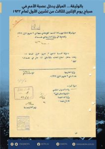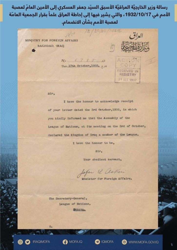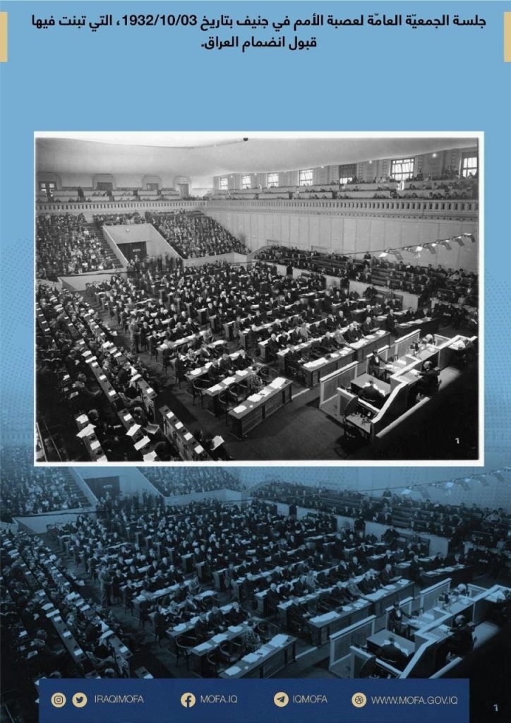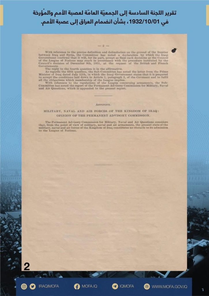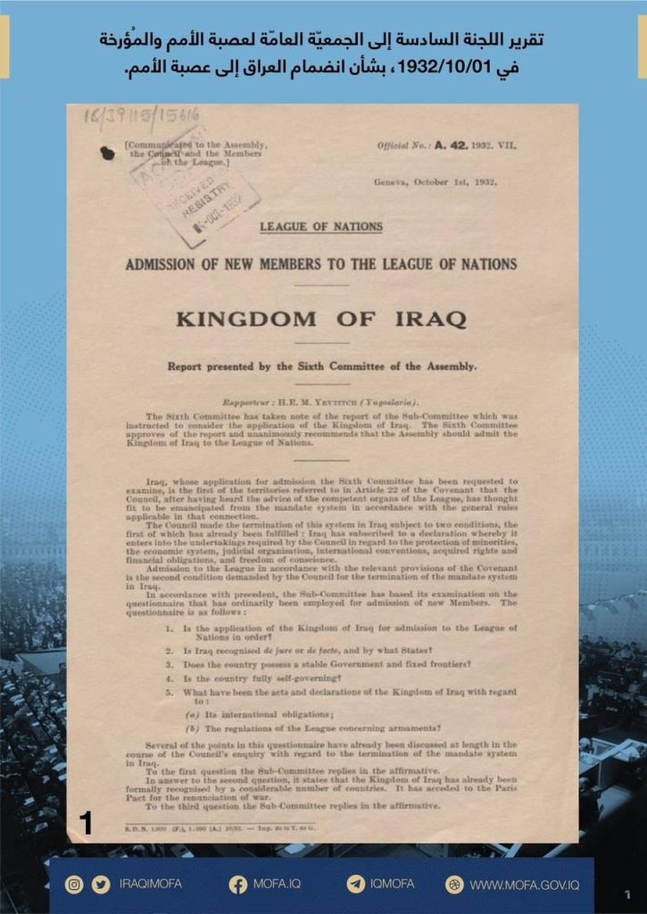 ووفقا للبيان، فإنَّ العراق كان أول دولة انضمت إلى عصبة الأمم بمُوجب المادة (22) من عهد عصبة الأمم الخاصة بالولاية والانتداب، بعد أن أصبح مؤهلاً للخروج من حالة الانتداب البريطانيّ التي وضع فيها بعد إنهيار الدولة العثمانيّة.