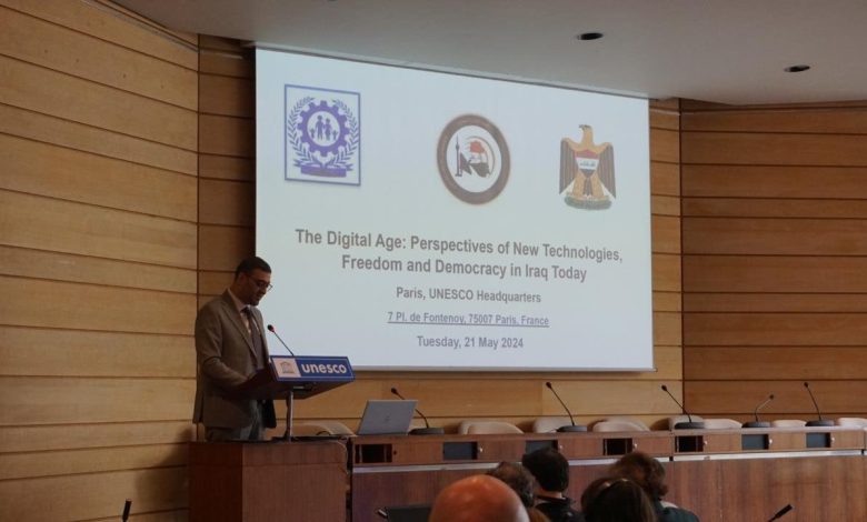 إن “رئيس هيئة الإعلام والاتصالات علي المؤيد شارك بورشة موسعة عن العصر الرقمي والحريات والديمقراطية في العراق في مقر اليونسكو بباريس، بحضور السفير العراقي لدى فرنسا وديع البتي وعدد من كبار المسؤولين التنفيذيين في منظمة اليونسكو”.