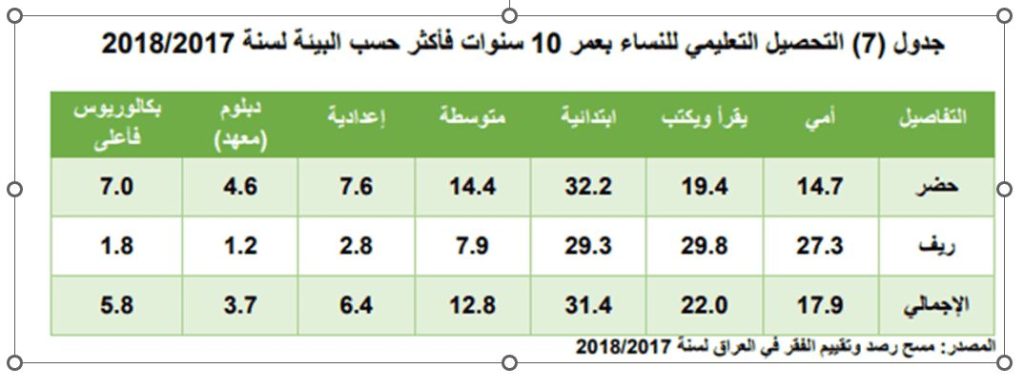 وقد أظهرت بيانات مسح رصد وتقييم الفقر في العراق لسنة 2018/2017 ارتفاع نسبة الفتيات والنساء الريفيات الأميات بعمر 10 سنوات فأكثر إذ بلغت نسبتهن 27.3%، مقارنة بنسبة الفتيات والنساء الأميات في المناطق الحضرية والبالغة نسبتهن 15%.