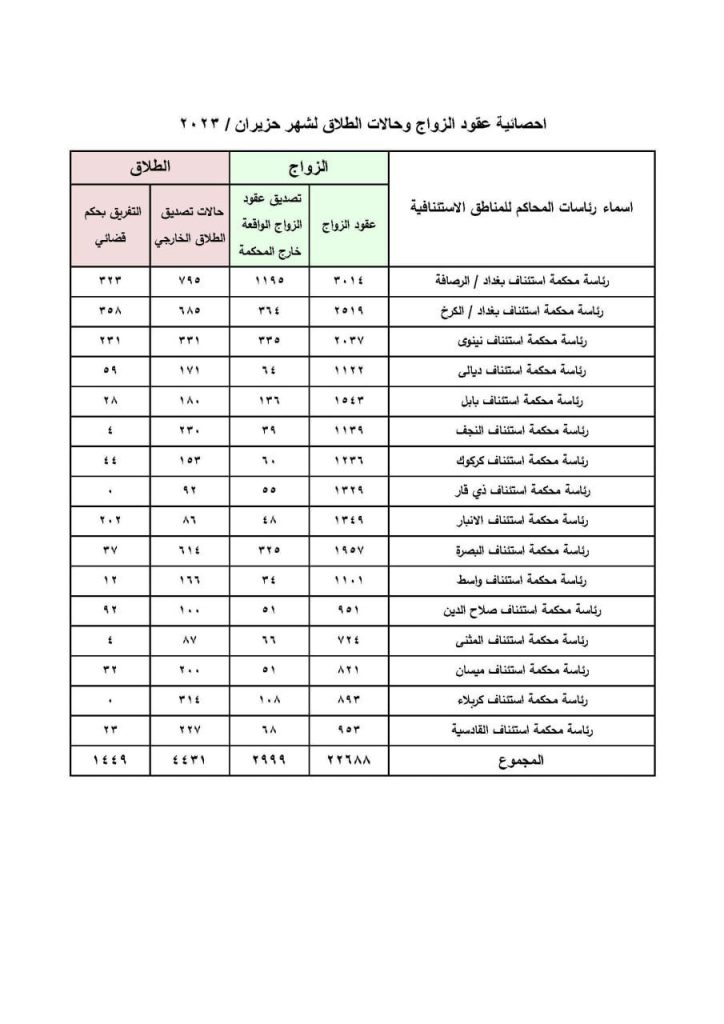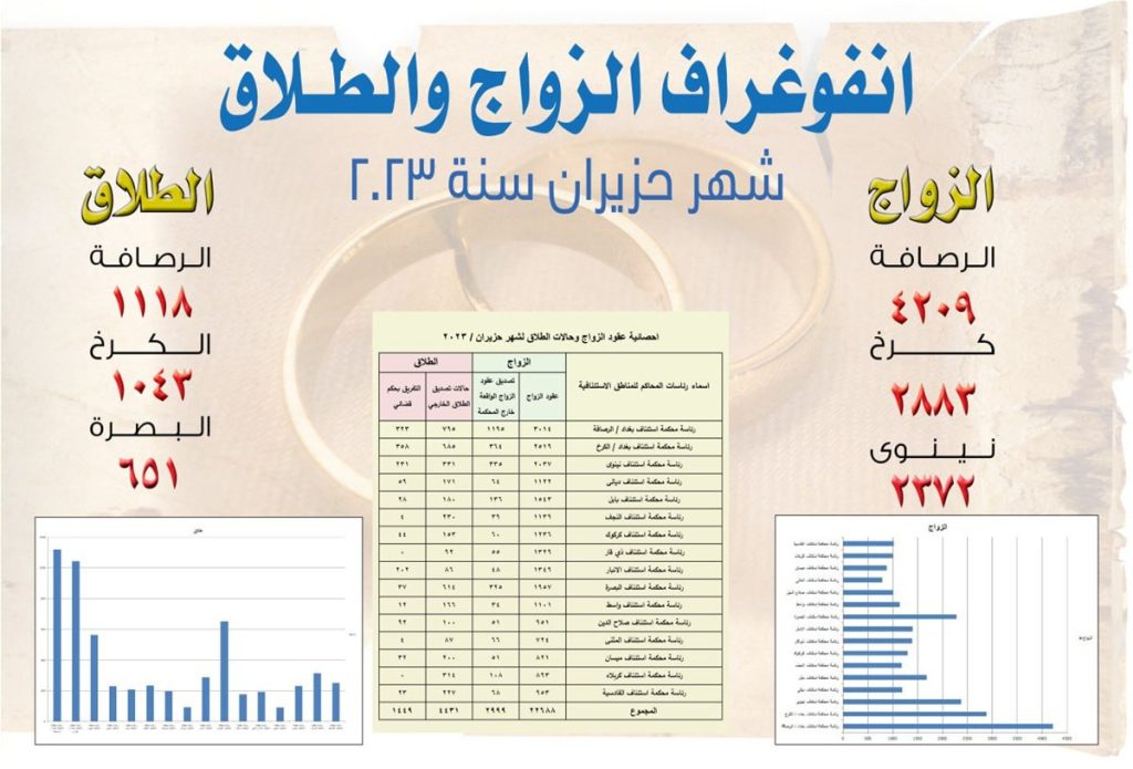 نشر مجلس القضاء الأعلى، اليوم الأربعاء 26 تموز/يوليو 2023، إحصائية شهر حزيران 2023 بشأن حالات الزواج والطلاق في العراق.