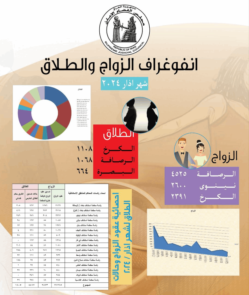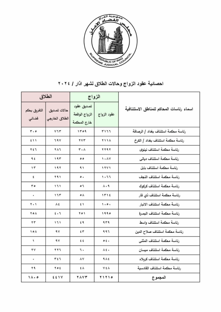 وأدناه جدولاً يوضح إحصائية الزواج والطلاق خلال شهر اذار الماضي من العام 2024: