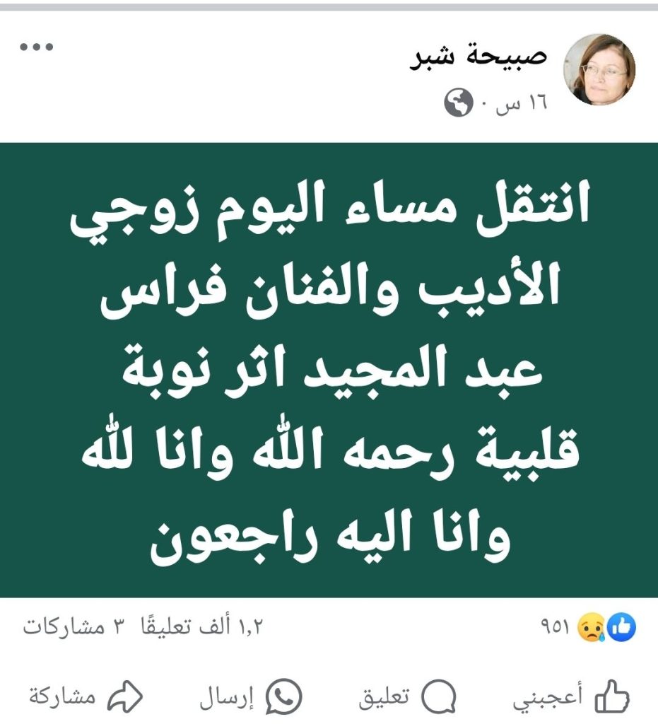 حيث ذكرت زوجته القاصة صبيحة شبر عبر تدوينة بحسابها على الفيسبوك: انتقل إلى رحمة الله مساء اليوم زوجي الأديب والفنان فراس عبدالمجيد أثر نوبة قلبية وأنا لله وانا اليه راجعون