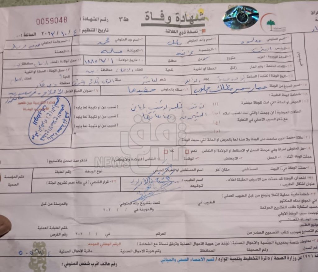 و ادناه نسخة من شهادة وفاة الراحلة صادرة عن وزارة الصحة العراقية، والتي تظهر تاريخ ولادتها.